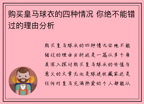 购买皇马球衣的四种情况 你绝不能错过的理由分析